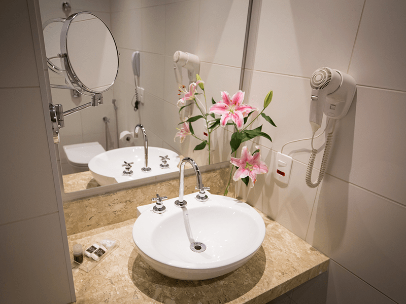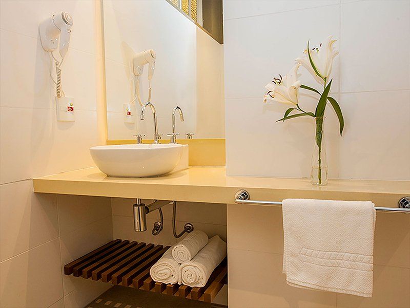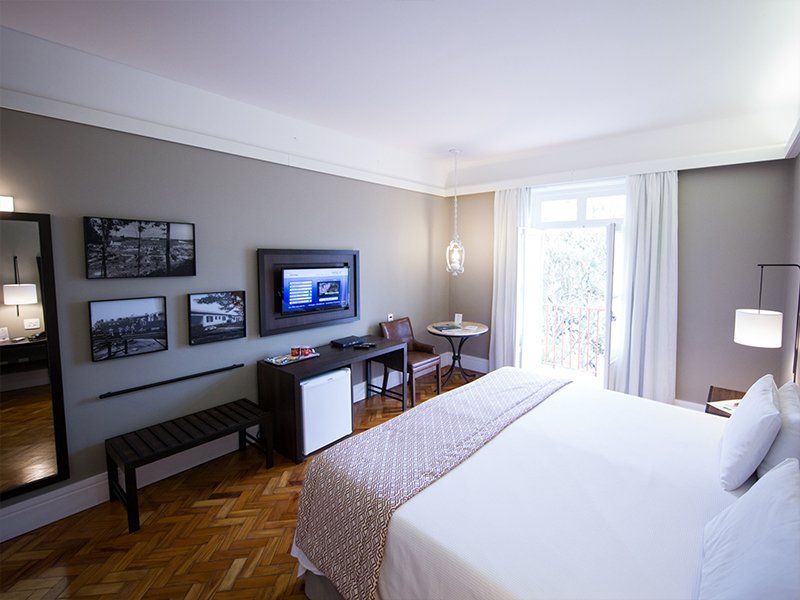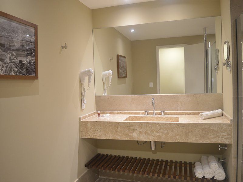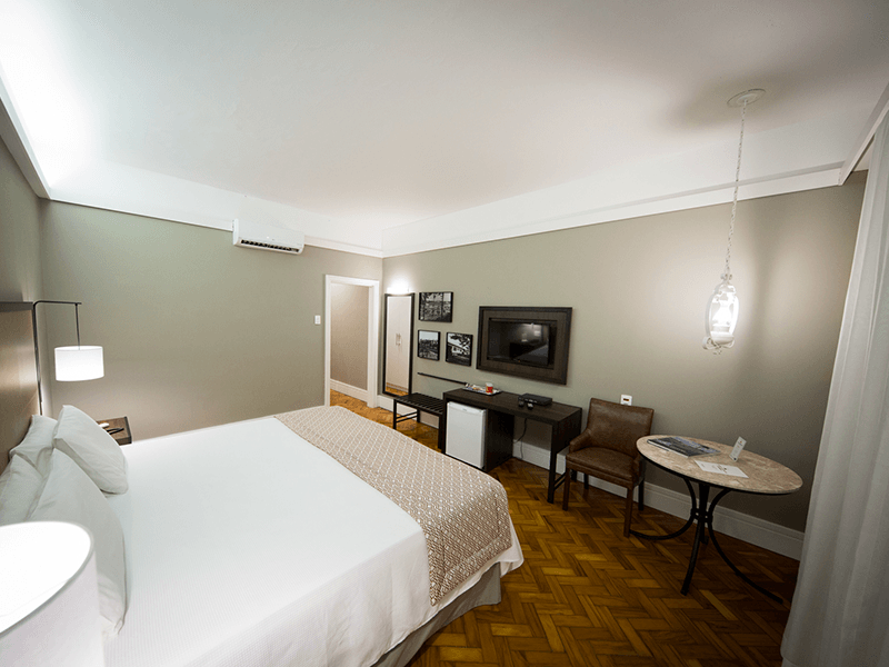Banheiro individual, secador, frigobar, cofre, TV de tela plana e Wi-Fi.