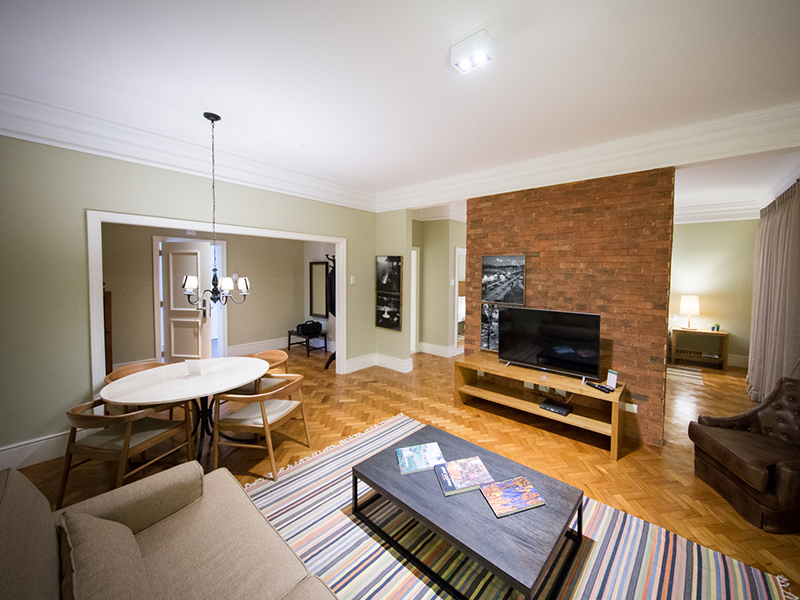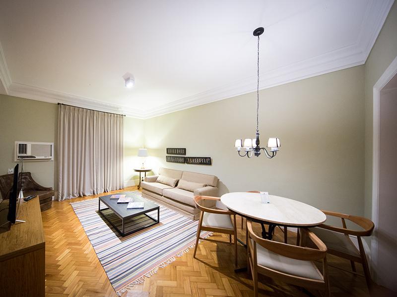 Apartamento conjugado, totalmente reformado, com 50 m², equipado com cama casal King Size, banheiro individual, TV de tela plana, Wifi, sala de TV com mesa de jantar. Ideal para quem busca conforto e comodidade em suas viagens.