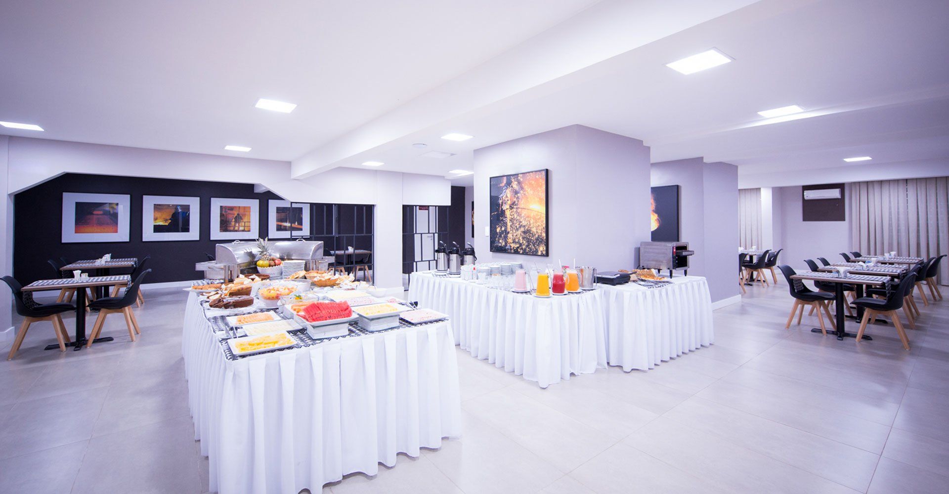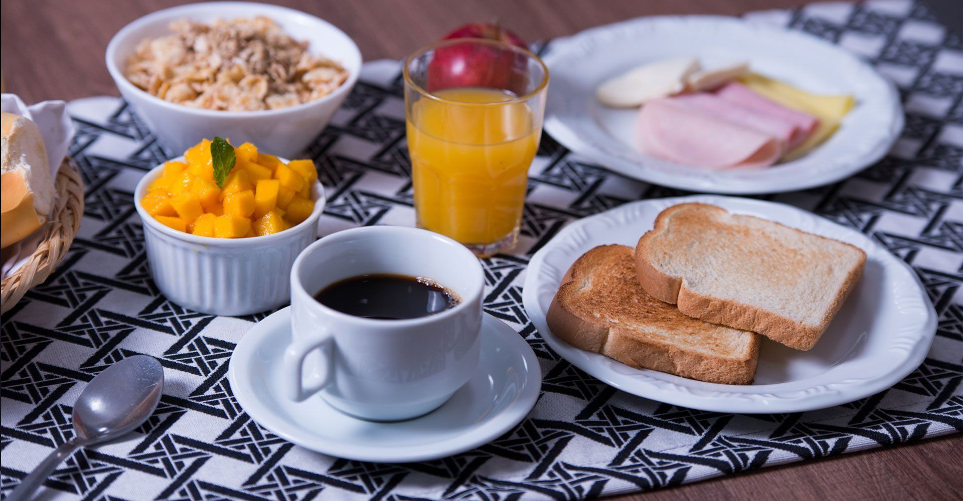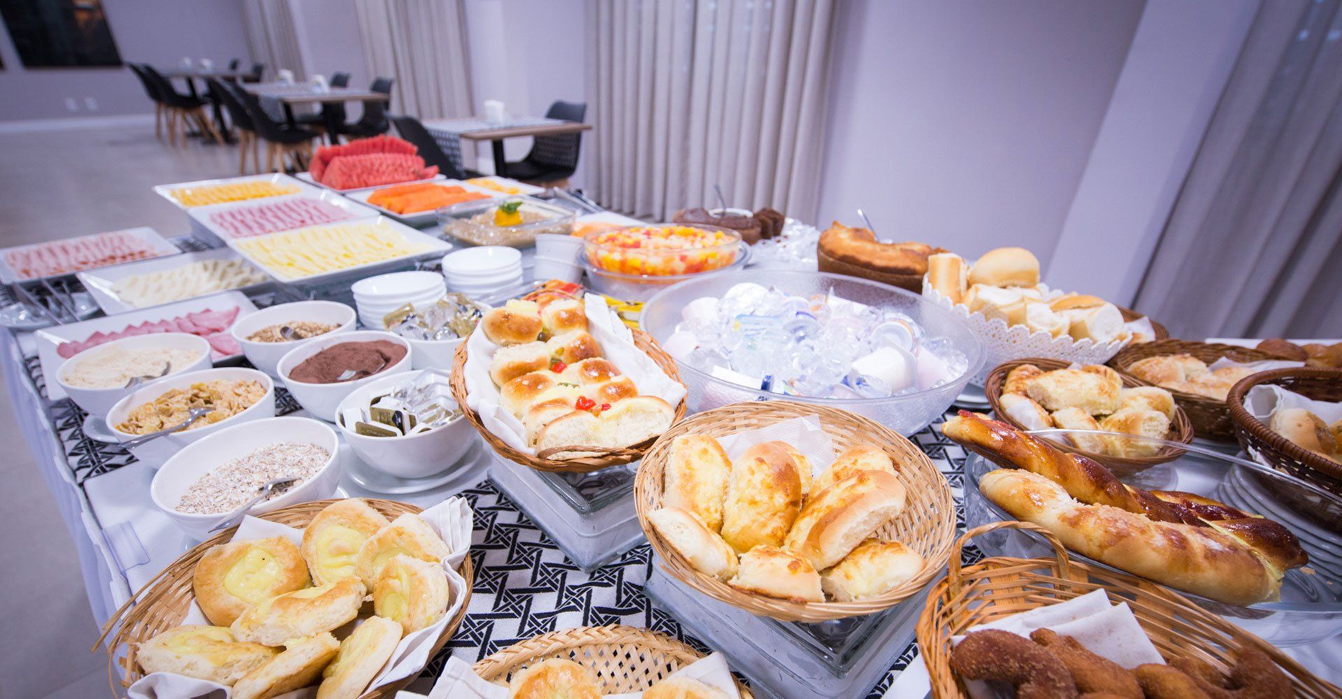 Delicioso Buffet com mais de 50 itens a vontade com produtos frescos e de alta qualidade, entre eles: pratos quentes variados, pães doces e salgados, bolos e tortas, frios, iogurtes, cereais, sucos, geleias e frutas de acordo com a estação do ano. É servido diariamente no restaurante, localizado no último andar do Hotel.