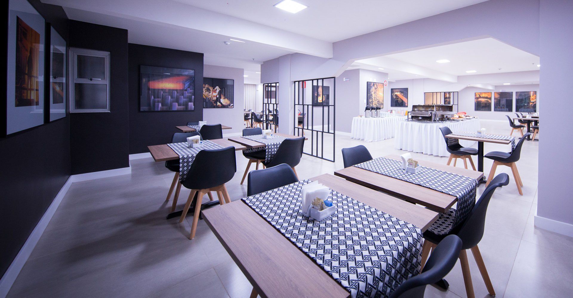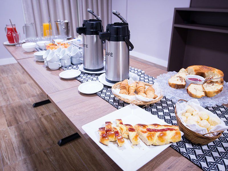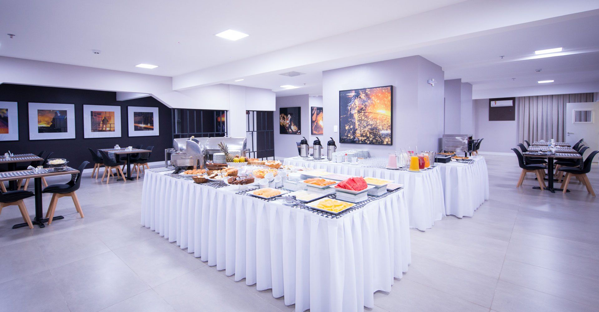 Delicioso Buffet com mais de 50 itens a vontade com produtos frescos e de alta qualidade, entre eles: pratos quentes variados, pães doces e salgados, bolos e tortas, frios, iogurtes, cereais, sucos, geleias e frutas de acordo com a estação do ano. É servido diariamente no restaurante, localizado no último andar do Hotel.