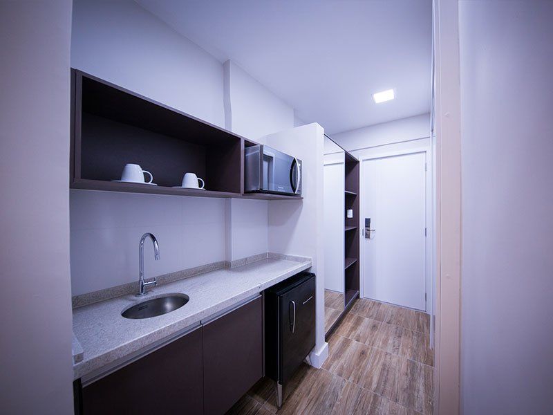 Oferecemos estrutura moderna, com apartamentos de 35m² para você aproveitar a sua estadia conosco com comodidade, conforto e praticidade! Quarto equipado com duas camas solteiro, banheiro individual, Mini cozinha e estação de trabalho.